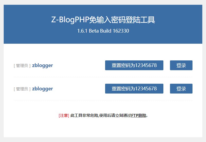 Z-BlogPHP密码找回工具,使用:通过FTP上传到Z-BlogPHP的根目录,在浏览器中打开nologin.php,使用过后此文件会自动删除。